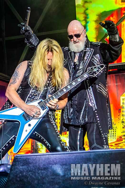 Photographs of Judas Priest at FirstBank Amphitheater in Franklin, Tn. – photos consist of vocalist Rob Halford, guitarist Richie Faulkner, guitarist Andy Sneap, bassist Ian Hill, and drummer Scott Travis.